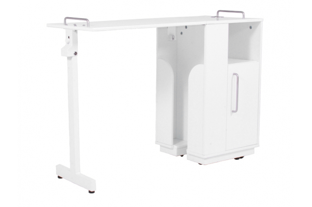 De Soleni nagelstudio tafel Standard II heeft een opklapbaar werkblad en biedt daarmee een zeer goede opbergmogelijkheid als de tafel niet in gebruik is. De onderkast is voorzien van 3 opbergvakken en een kabeldoorvoer. Twee extra handgrepen rechts- en linksboven op het werkblad en 4 wielen maken het gemakkelijk om de tafel te verplaatsen. De kleur van de nagelstudio tafel is wit.